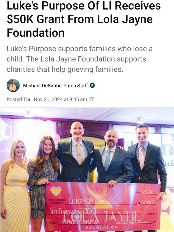 Luke's Purpose received a $50,000 grant from The Lola Jayne Foundation at their annual fundraiser. We are so thankful to Chris and Mary White for choosing Luke's Purpose to be this year's grant recipient. These funds will help loss families with funeral bills, medical bills, mental health fees, and so much more.